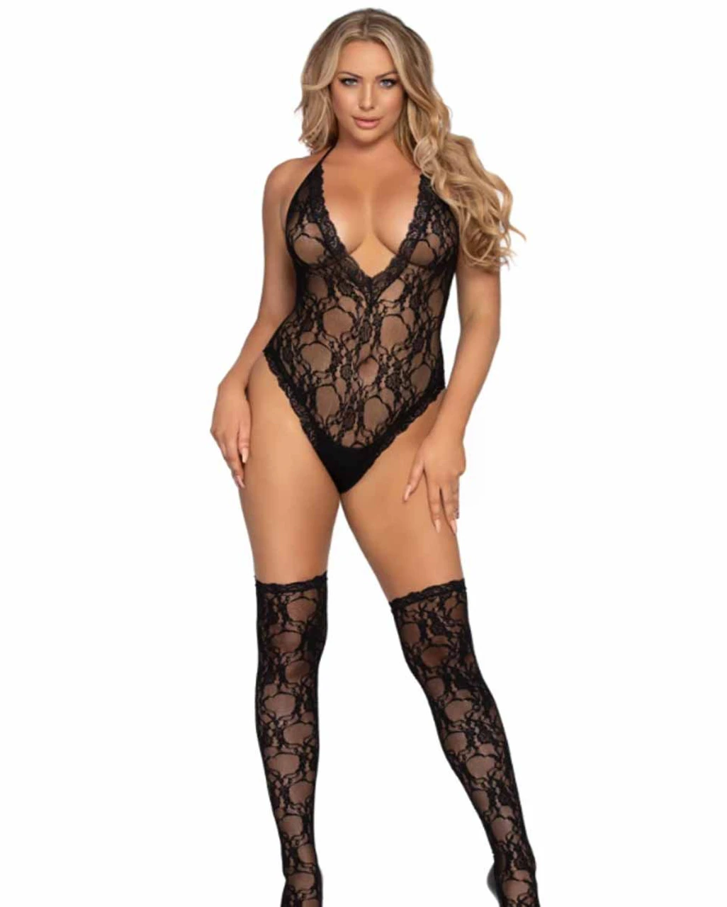 Floral lace deep-V teddy and matching stocking.Â