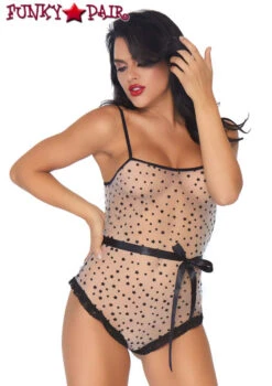 Lace trimmed sheer flocked star bodysuit with snap crotch and ribbon tie.