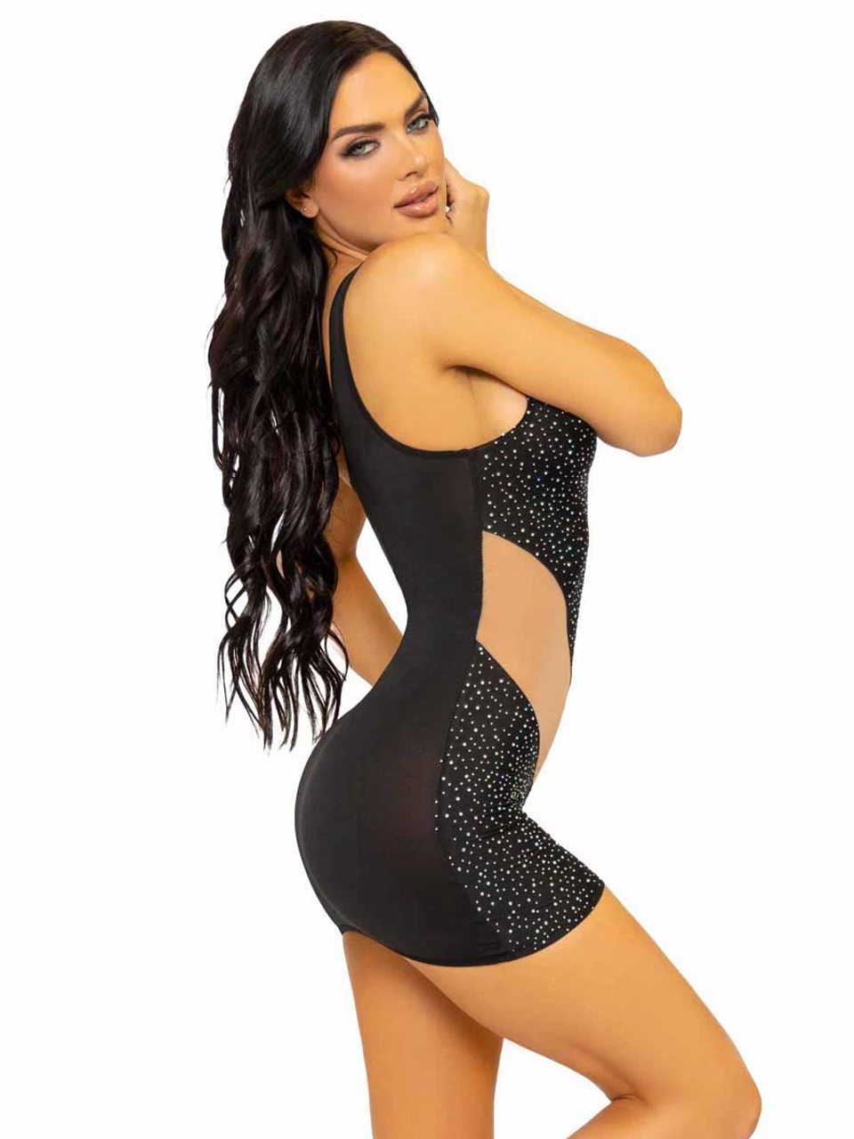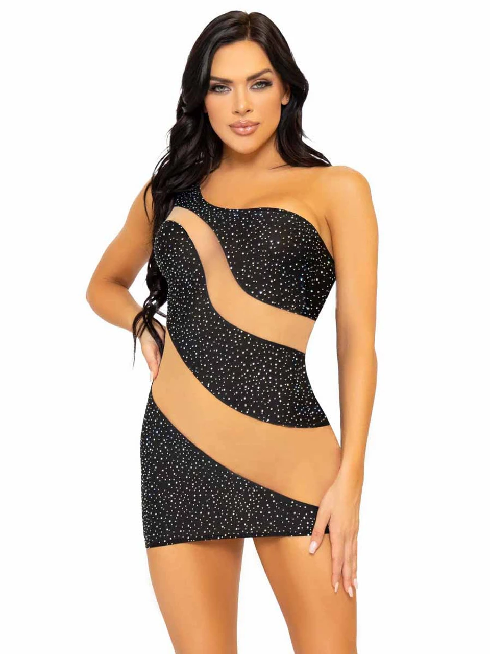 Rhinestone spandex asymmetrical mini dress with mesh panel accents.