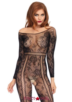 Seamless lace long sleeved bodystocking with lace up net stripe detail. by Leg Avenue 89209