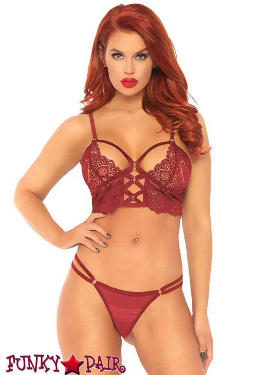 The perfect lingerie set for an alluring look, this bralette and sheer g-string is crafted from delicate lace and features a cage strap top and O-ring bodice detail. Show off your sexy side while feeling comfortable and secure.