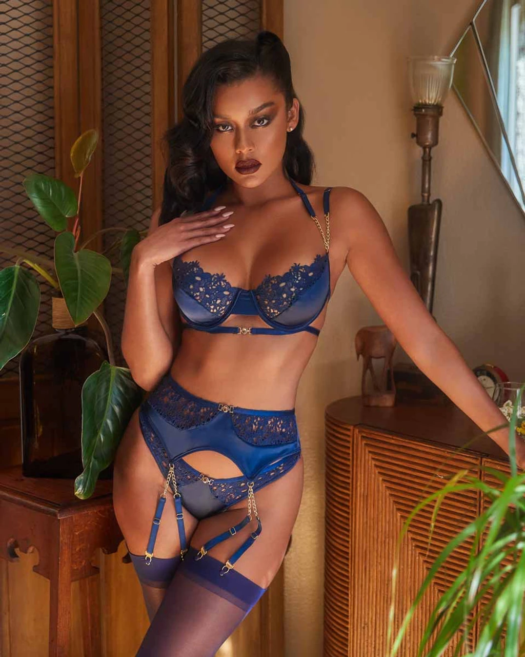 3PC Enbroidery Lace & Satin Bra set includes underwire bra, garter belt and panty.