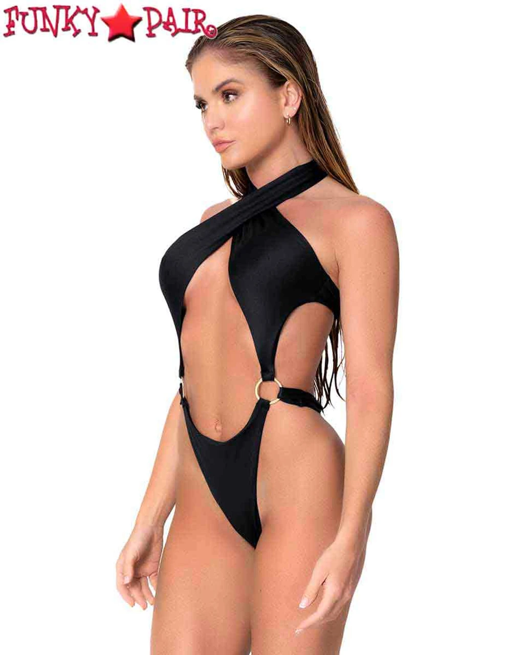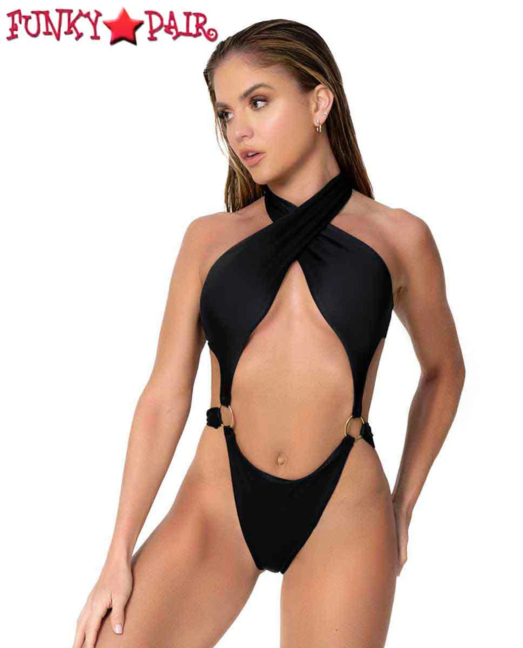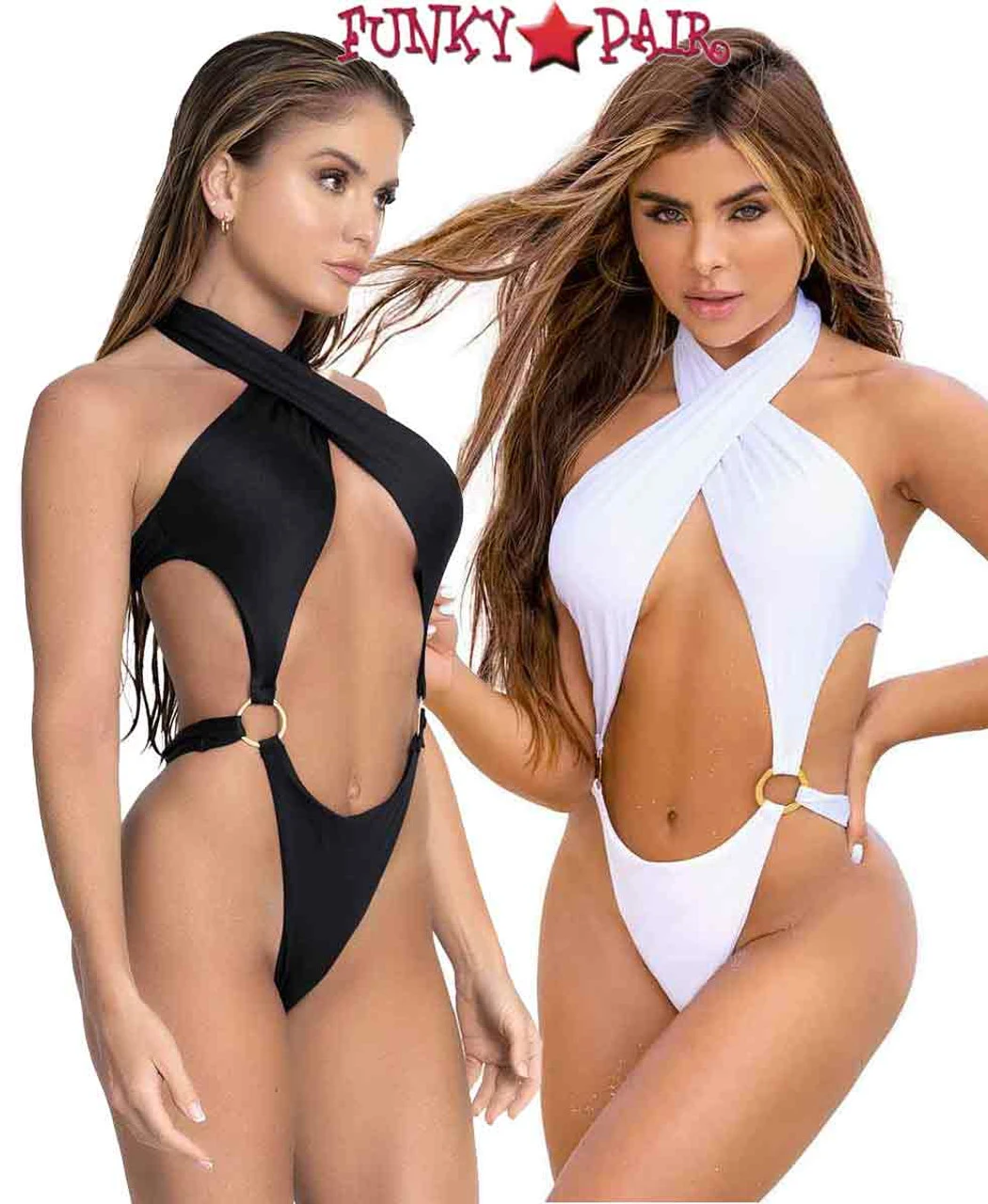 1PC Halter criss-cross neck bodysuit with ring design at waist, tie at the back & neck, and thong bottom.