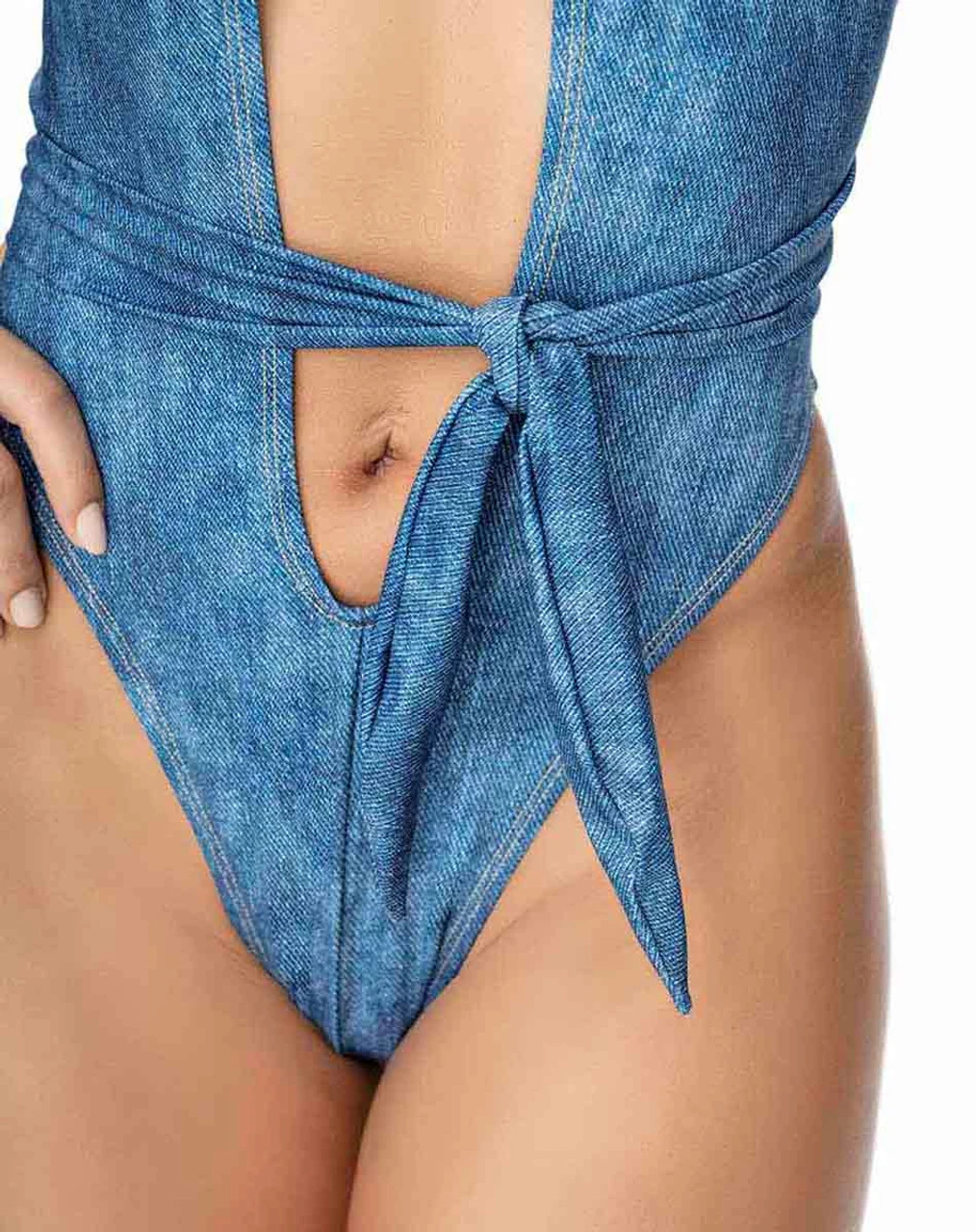 Light wash denim print bodysuit with criss cross halter neck design and thong back. Adjustable waist belt included.