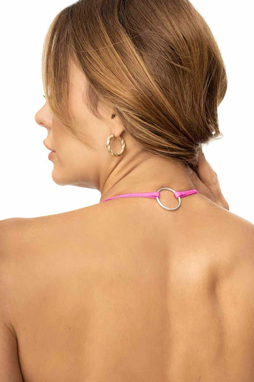 2PC Gloss pink finish bikini set with multiway top with silver ring detail and matching Brazilian thong.