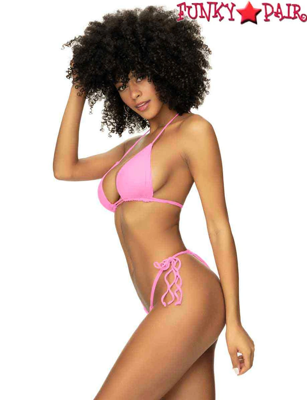 2PC Pink bikini set with triangle top and double strap adjustable coverage bottom.