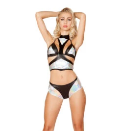 Make a statement in this eye-catching Foil Short Set! The flashy triangle top and matching shorts will take your look to the next level.