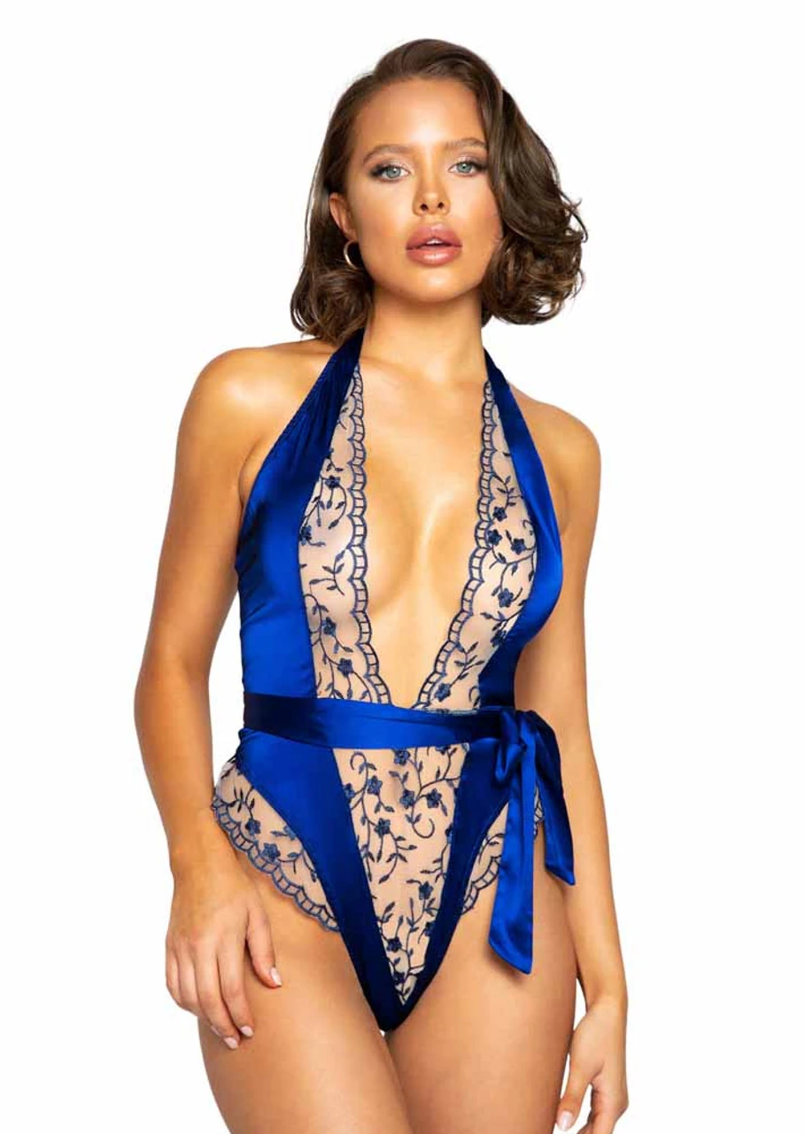 Stunning Low Plunge Teddy with Floral Embroidery and Dark Blue Satin with Matching Tie