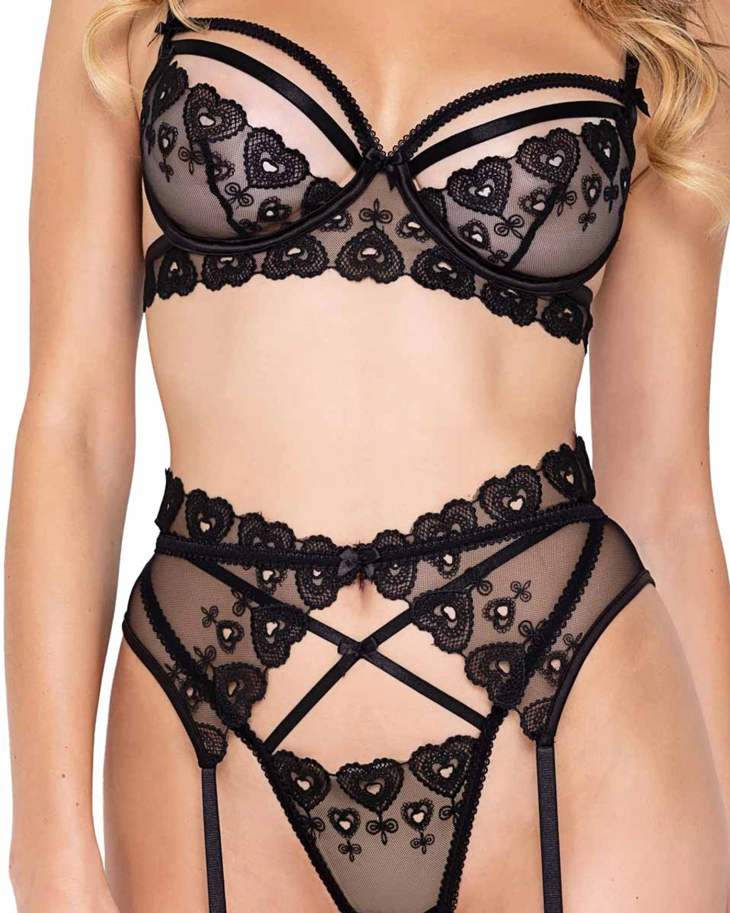 3 PC Lace Heart and Dot Mesh Garter Set includes: Lace heart & dot mesh plunge cup underwire bra, matching garter belt with adjustable straps, and single string thong with back heart hardware. Stockings not included.