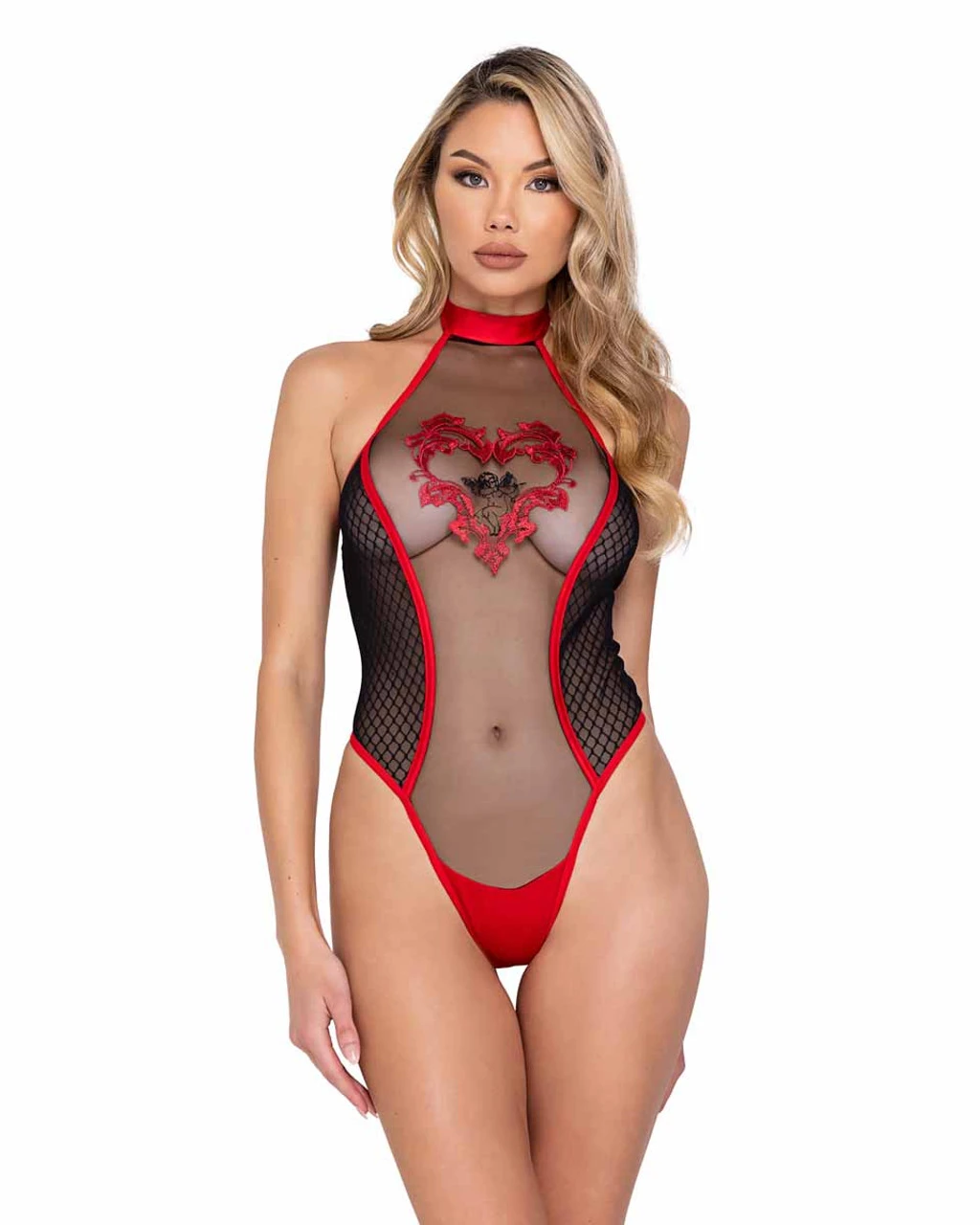 1pc Diamond mesh & tulle, Satin trim with adjustable neck sash, Cupid & flourish heart embroidery and Single string thong back