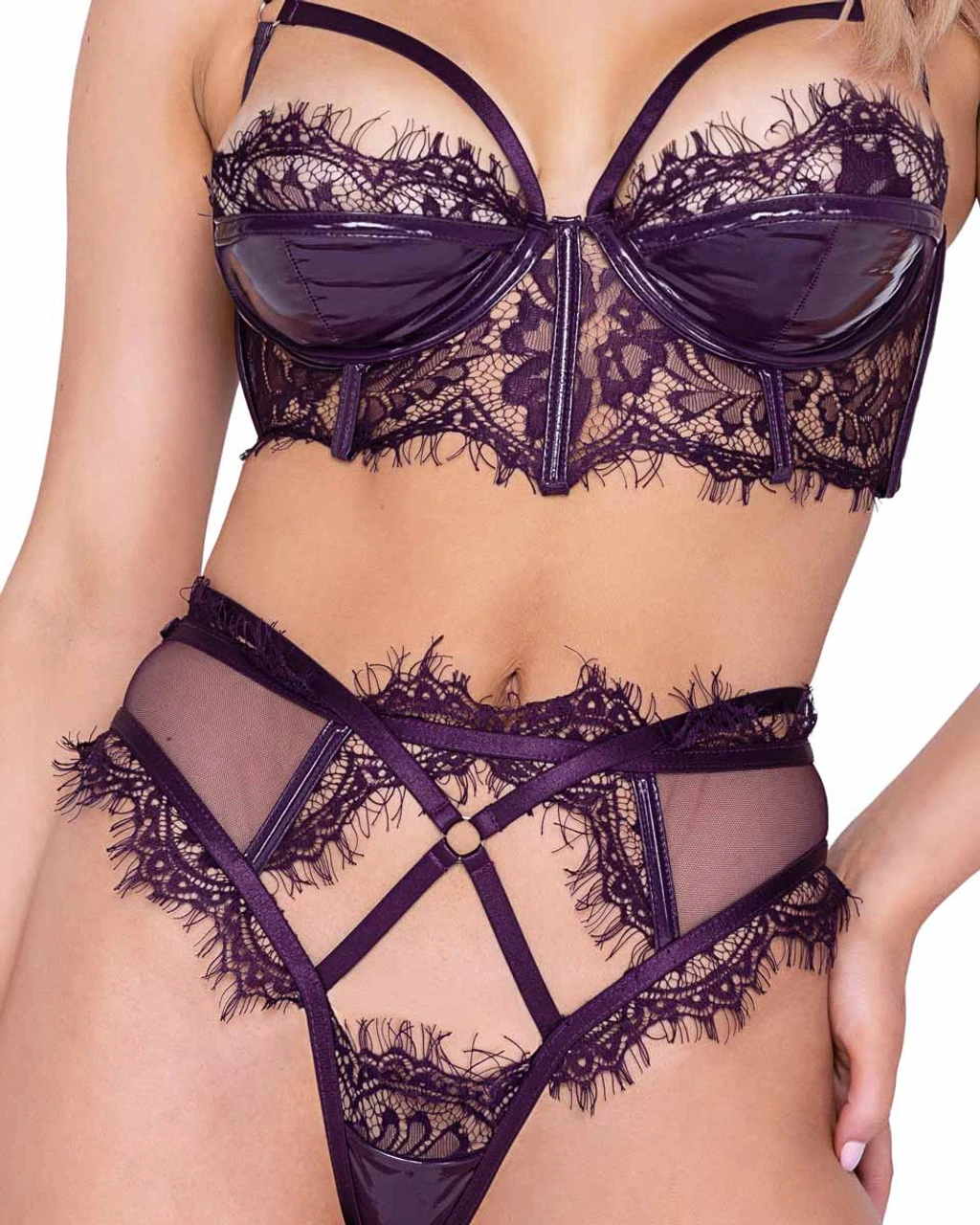 2 PC Eyelash Lace and Leather Trim Long Line Bra Set includes: scalloped eyelash lace trim & tulle long line bra with faux patent leather trim & underwire and matching high waisted thong.