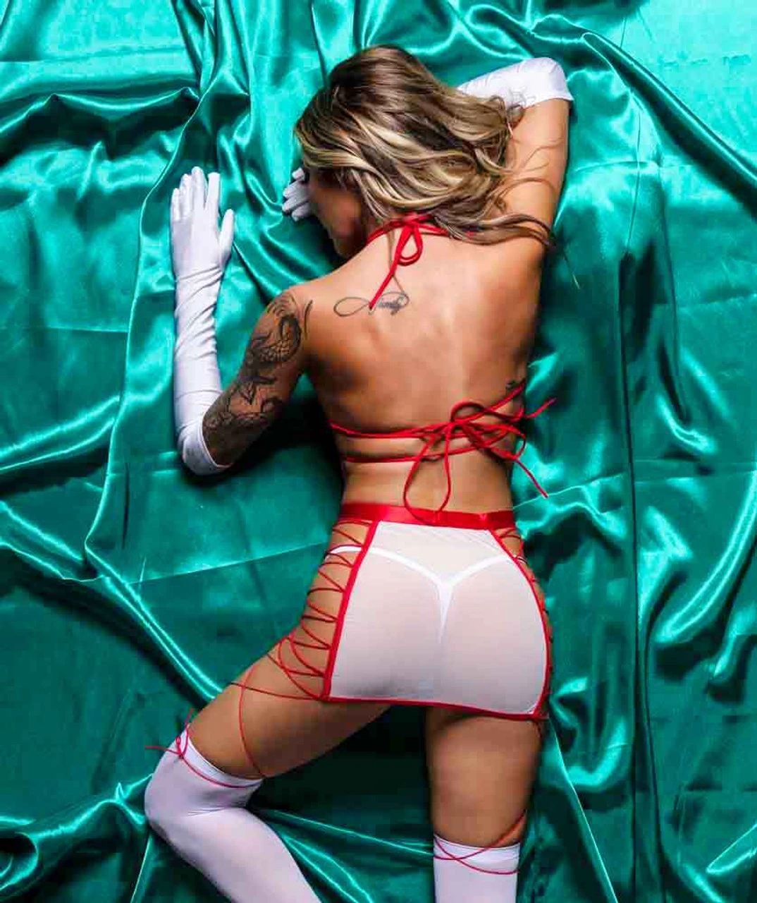 5 PC Naughty Nurse set includes: 1 cross top, 1 mesh skirt with strappy detail, 1 thong, 1 pair of gloves, and 1 pair of thigh high stockings.