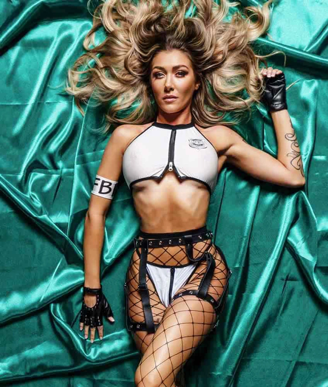 6 PC Frisky Body Inspector F.B.I. set includes: 1 zipper halter top, 1 matching thong, 1 garterbelt, 1 pair of gloves, 1 F.B.I. arm band, and 1 pair of fishnets.