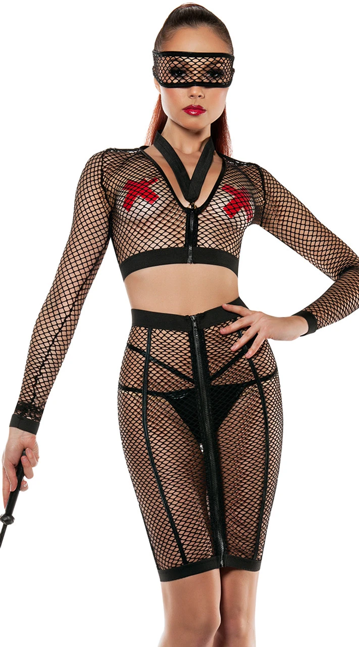 Micro fishnet long sleeve crop top lingerie with skirt, G-string, and eye mask. (Red Fringe Whip (A6011) sold separately.)