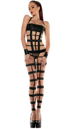 Strappy bondage playsuit with elastic strap leg pieces and cuffs with hand ties. by Starline SL5017