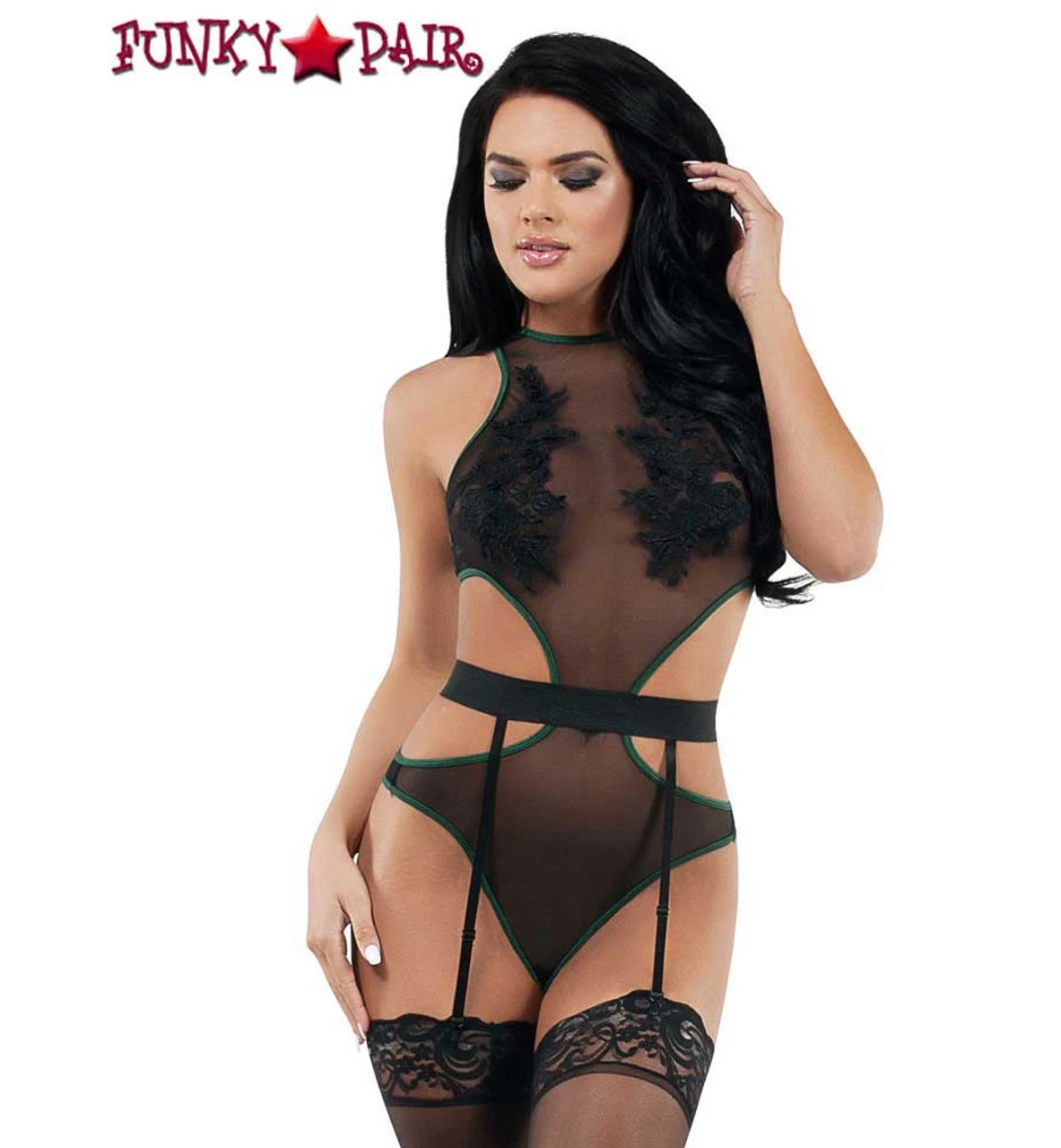 Black mesh with contrast jade binding trimmed with black lace appliqué and attached garters