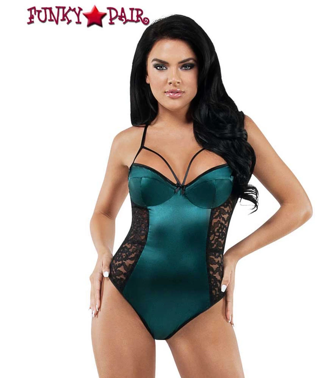 Jade satin with black lace underwire cup teddy.